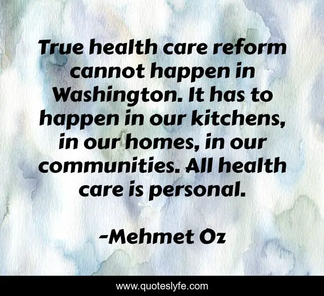 This page presents the quote "True health care reform cannot happen in Washington. It has to happen in our kitchens, in our homes, in our communities. All health care is personal.". Author of this quote is Mehmet Oz. This quote is about personal, true, care,.