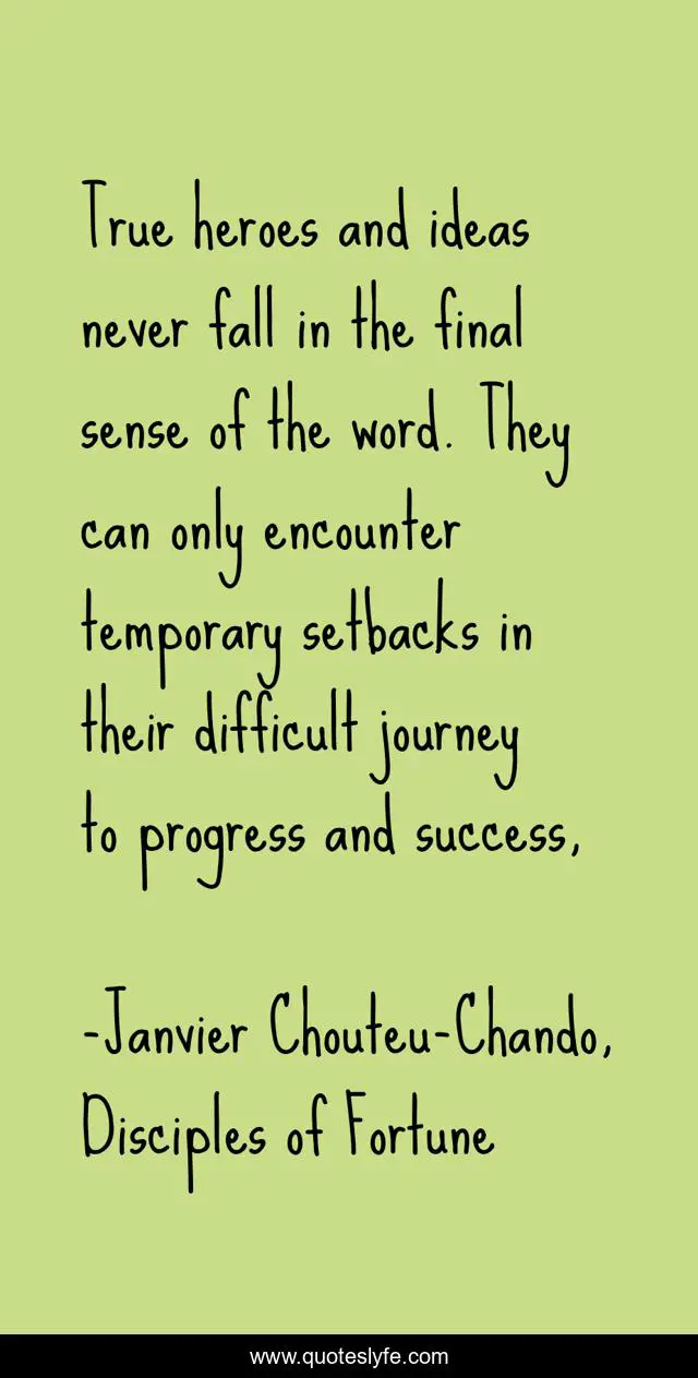 This page presents the quote "True heroes and ideas never fall in the final sense of the word. They can only encounter temporary setbacks in their difficult journey to progress and success, ". Author of this quote is Janvier Chouteu-Chando, Disciples of Fortune. This quote is about love, family, optimistic, confidence, humor, positive, romance, spirituality, enthusiasm,.