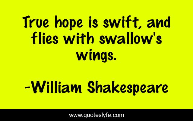 This page presents the quote "True hope is swift, and flies with swallow's wings.". Author of this quote is William Shakespeare. This quote is about flies, swallows, shakespeare, swift, wings, hope,.