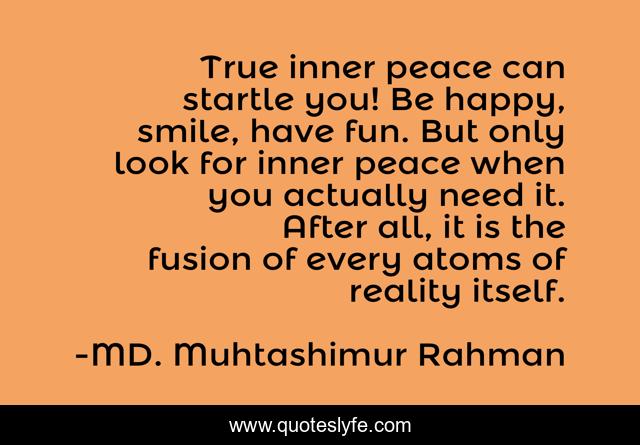 This page presents the quote "True inner peace can startle you! Be happy, smile, have fun. But only look for inner peace when you actually need it. After all, it is the fusion of every atoms of reality itself.". Author of this quote is MD. Muhtashimur Rahman. This quote is about life, love, human, beauty, self-realization, peace, spiritual, spirituality, awakening,.