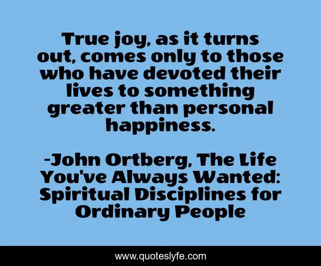 This page presents the quote "True joy, as it turns out, comes only to those who have devoted their lives to something greater than personal happiness.". Author of this quote is John Ortberg, The Life You've Always Wanted: Spiritual Disciplines for Ordinary People. .