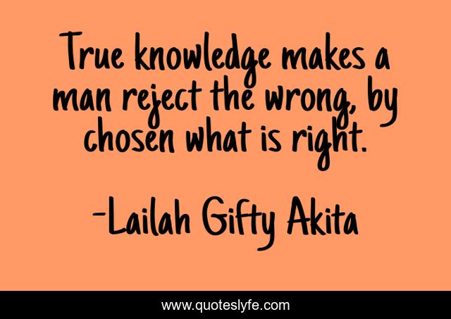 This page presents the quote "True knowledge makes a man reject the wrong, by chosen what is right.". Author of this quote is Lailah Gifty Akita. This quote is about right, knowledge, choice, choose, wisdom, wrong-sin,.