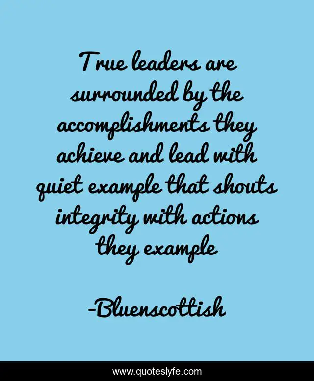 This page presents the quote "True leaders are surrounded by the accomplishments they achieve and lead with quiet example that shouts integrity with actions they example". Author of this quote is Bluenscottish. This quote is about bluenscottish, leadership, integrity, lead,.
