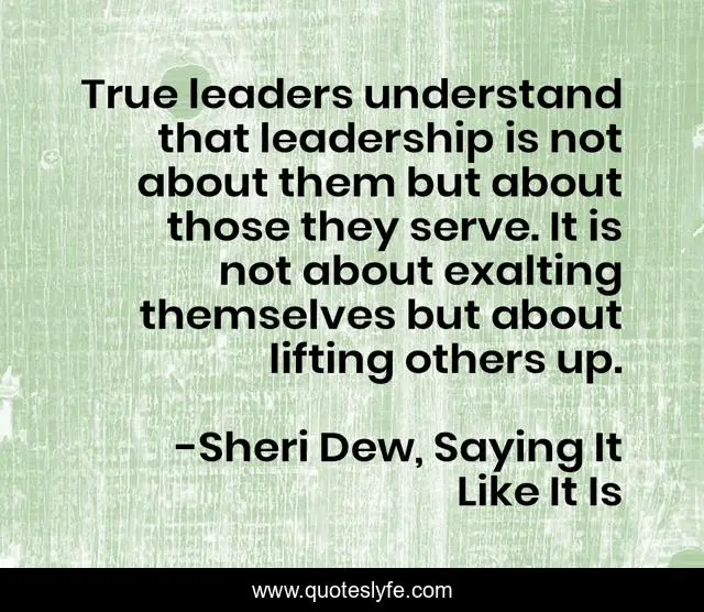 This page presents the quote "True leaders understand that leadership is not about them but about those they serve. It is not about exalting themselves but about lifting others up.". Author of this quote is Sheri Dew, Saying It Like It Is. This quote is about leadership, service,.