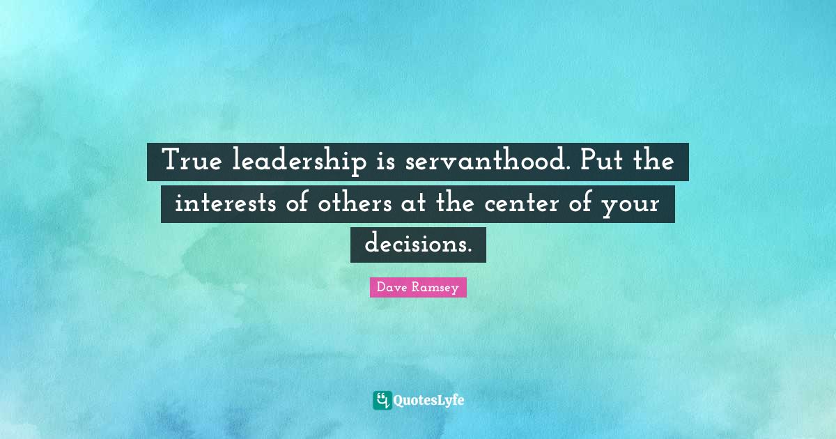 This page presents the quote "True leadership is servanthood. Put the interests of others at the center of your decisions.". Author of this quote is Dave Ramsey. This quote is about decision, servanthood, true leader, true leadership, interest,.