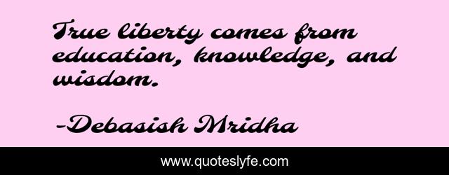 This page presents the quote "True liberty comes from education, knowledge, and wisdom.". Author of this quote is Debasish Mridha. This quote is about knowledge, mridha, philosophy, liberty, wisdom, quotes, inspirational, enthusiasm, education,.