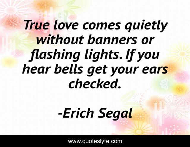 This page presents the quote "True love comes quietly without banners or flashing lights. If you hear bells get your ears checked.". Author of this quote is Erich Segal. .
