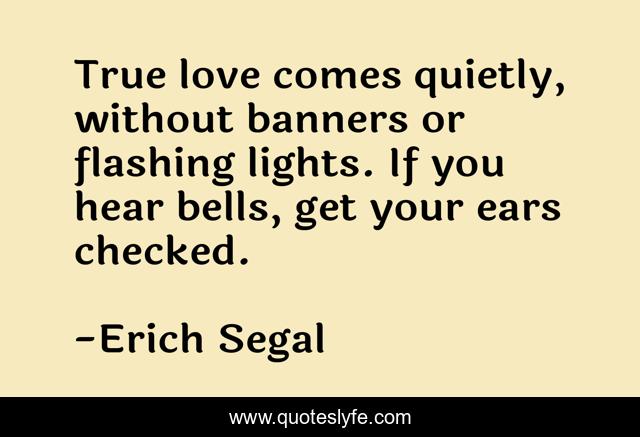 This page presents the quote "True love comes quietly, without banners or flashing lights. If you hear bells, get your ears checked.". Author of this quote is Erich Segal. This quote is about love, affection,.