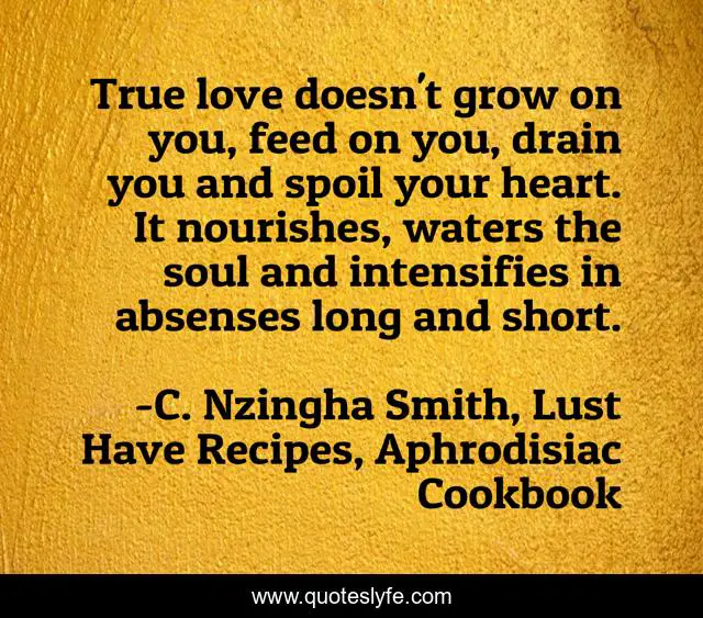 This page presents the quote "True love doesn't grow on you, feed on you, drain you and spoil your heart. It nourishes, waters the soul and intensifies in absenses long and short.". Author of this quote is C. Nzingha Smith, Lust Have Recipes, Aphrodisiac Cookbook. This quote is about true-love, love, affection, romantic-love,.