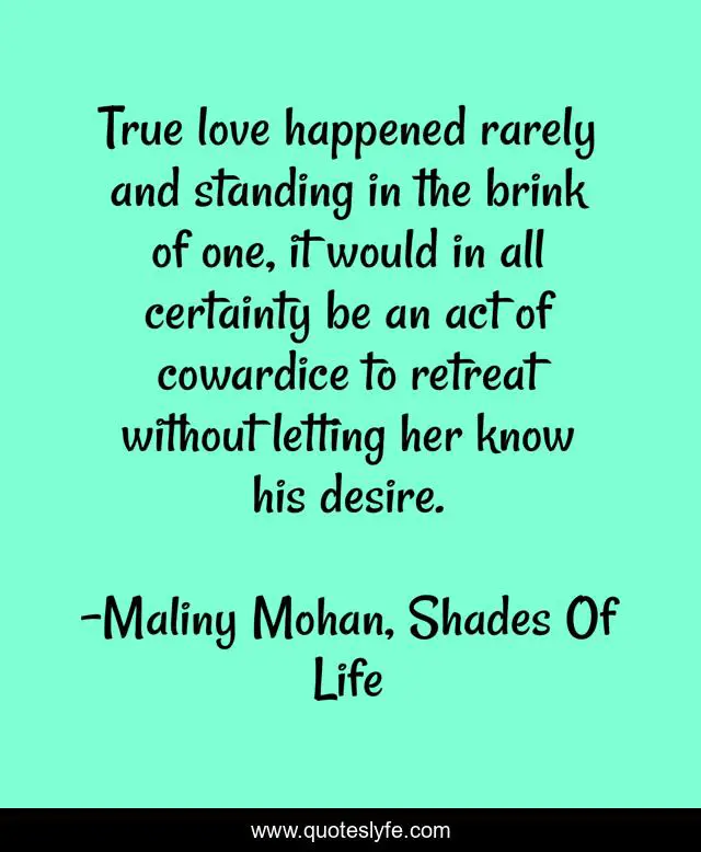 This page presents the quote "True love happened rarely and standing in the brink of one, it would in all certainty be an act of cowardice to retreat without letting her know his desire.". Author of this quote is Maliny Mohan, Shades Of Life. This quote is about true-love, love, colors, shades-of-life, life-lessons, affection,.