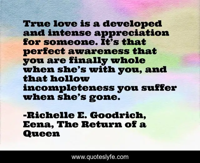 This page presents the quote "True love is a developed and intense appreciation for someone. It’s that perfect awareness that you are finally whole when she’s with you, and that hollow incompleteness you suffer when she’s gone.". Author of this quote is Richelle E. Goodrich, Eena, The Return of a Queen. This quote is about incompleteness, love, devotion, derian, appreciation, richelle, eena, richelle-goodrich, affection,.