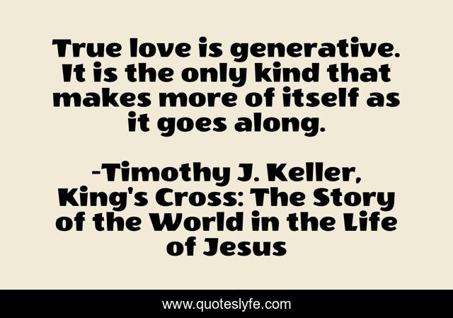 This page presents the quote "True love is generative. It is the only kind that makes more of itself as it goes along.". Author of this quote is Timothy J. Keller, King's Cross: The Story of the World in the Life of Jesus. This quote is about discipleship, self-sacrifice,.