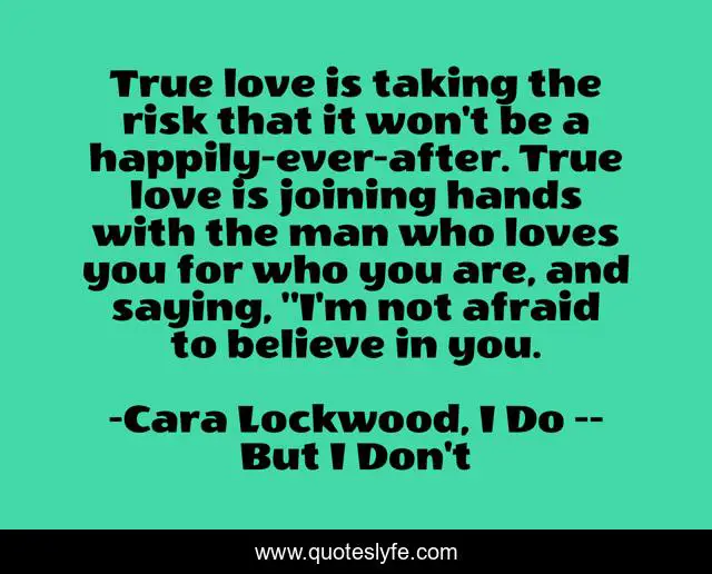 This page presents the quote "True love is taking the risk that it won't be a happily-ever-after. True love is joining hands with the man who loves you for who you are, and saying, "I'm not afraid to believe in you.". Author of this quote is Cara Lockwood, I Do -- But I Don't. This quote is about true-love, faith, risk,.