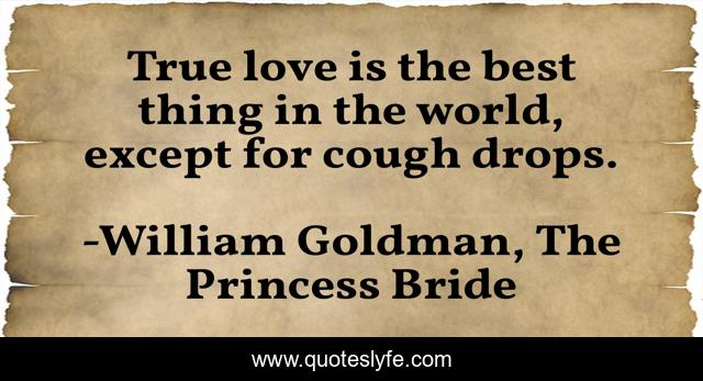 This page presents the quote "True love is the best thing in the world, except for cough drops.". Author of this quote is William Goldman, The Princess Bride. This quote is about true-love, cough-drops, love, affection,.