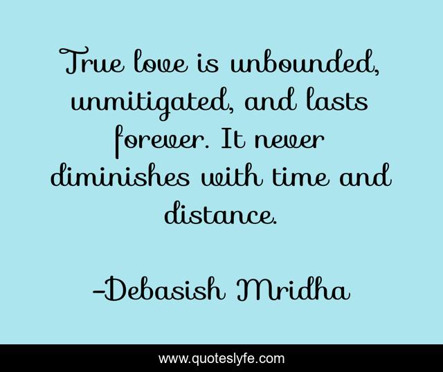 This page presents the quote "True love is unbounded, unmitigated, and lasts forever. It never diminishes with time and distance.". Author of this quote is Debasish Mridha. This quote is about true-love, love, debasish-mridha, love-forever, debasish-mridha-m-d, affection,.