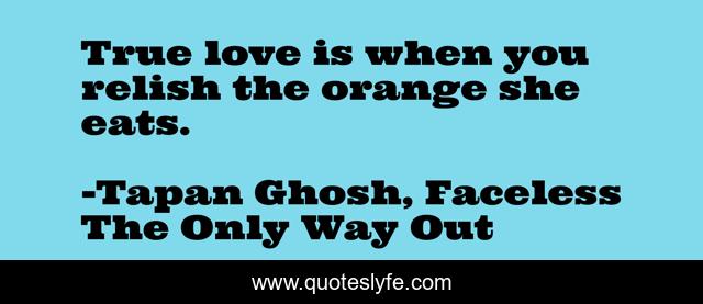 This page presents the quote "True love is when you relish the orange she eats.". Author of this quote is Tapan Ghosh, Faceless The Only Way Out. This quote is about true-love, love, affection,.