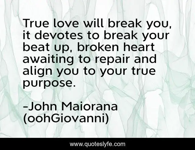 This page presents the quote "True love will break you, it devotes to break your beat up, broken heart awaiting to repair and align you to your true purpose.". Author of this quote is John Maiorana (oohGiovanni). This quote is about broken-heart, heartache, spiritual, love, relationships, heartbreak, purpose, real-love, affection,.