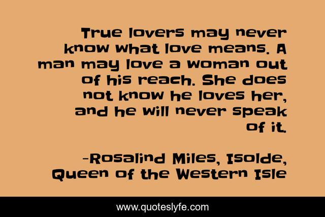 This page presents the quote "True lovers may never know what love means. A man may love a woman out of his reach. She does not know he loves her, and he will never speak of it.". Author of this quote is Rosalind Miles, Isolde, Queen of the Western Isle. This quote is about love, affection, women,.