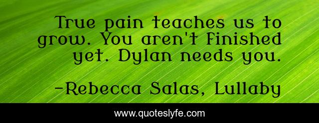 This page presents the quote "True pain teaches us to grow. You aren't finished yet. Dylan needs you.". Author of this quote is Rebecca Salas, Lullaby. This quote is about mermaids, enthusiasm, growth, pain, inspirational,.