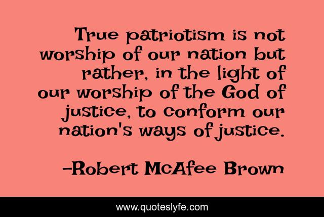 This page presents the quote "True patriotism is not worship of our nation but rather, in the light of our worship of the God of justice, to conform our nation's ways of justice.". Author of this quote is Robert McAfee Brown. This quote is about enthusiasm, patriotism, inspirational, christianity,.