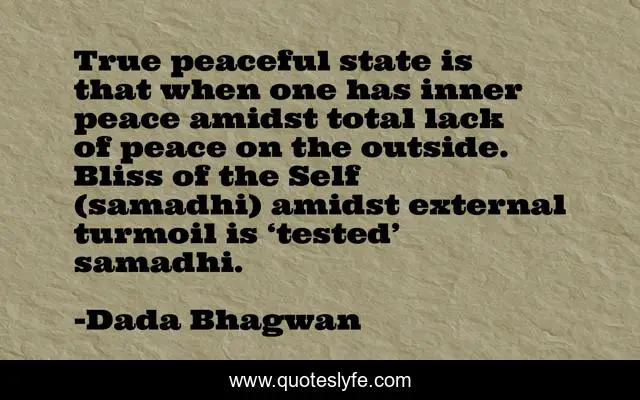 This page presents the quote "True peaceful state is that when one has inner peace amidst total lack of peace on the outside. Bliss of the Self (samadhi) amidst external turmoil is ‘tested’ samadhi.". Author of this quote is Dada Bhagwan. This quote is about spiritual, samadhi, self, peace, soul, bliss, peaceful, atma, happiness,.