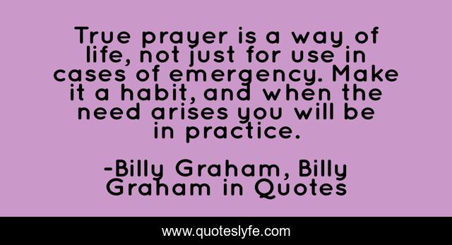 This page presents the quote "True prayer is a way of life, not just for use in cases of emergency. Make it a habit, and when the need arises you will be in practice.". Author of this quote is Billy Graham, Billy Graham in Quotes. This quote is about billy-graham, prayer,.