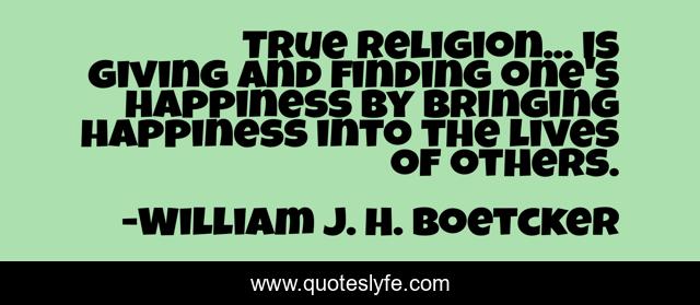 This page presents the quote "True religion... is giving and finding one's happiness by bringing happiness into the lives of others.". Author of this quote is William J. H. Boetcker. This quote is about giving, religion, finding,.