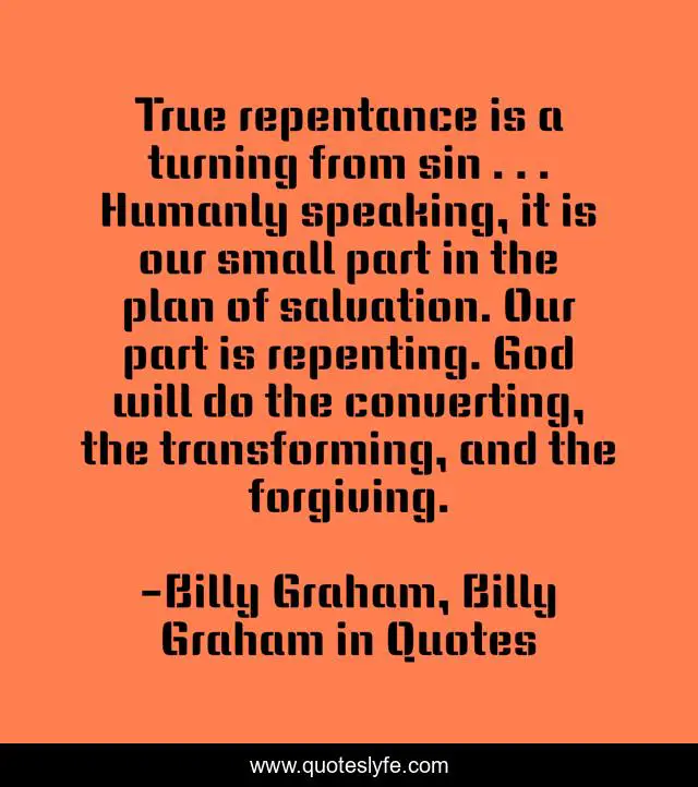 This page presents the quote "True repentance is a turning from sin . . . Humanly speaking, it is our small part in the plan of salvation. Our part is repenting. God will do the converting, the transforming, and the forgiving.". Author of this quote is Billy Graham, Billy Graham in Quotes. This quote is about transforming, god, billy-graham, repentence, converting, forgiving, salvation, sin,.