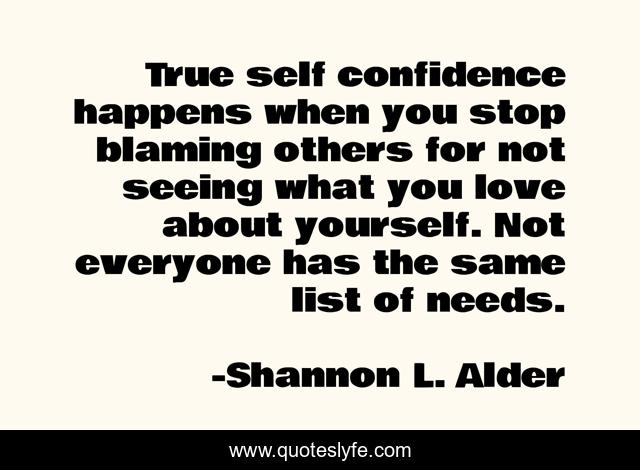 This page presents the quote "True self confidence happens when you stop blaming others for not seeing what you love about yourself. Not everyone has the same list of needs.". Author of this quote is Shannon L. Alder. This quote is about confident, confidence, self-love, empowering-women, different-perspective,.