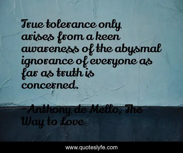 This page presents the quote "True tolerance only arises from a keen awareness of the abysmal ignorance of everyone as far as truth is concerned.". Author of this quote is Anthony de Mello, The Way to Love. This quote is about tolerance, ignorance, truth,.