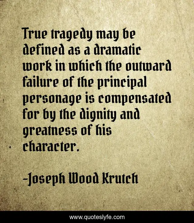 This page presents the quote "True tragedy may be defined as a dramatic work in which the outward failure of the principal personage is compensated for by the dignity and greatness of his character.". Author of this quote is Joseph Wood Krutch. This quote is about acting, theatre,.