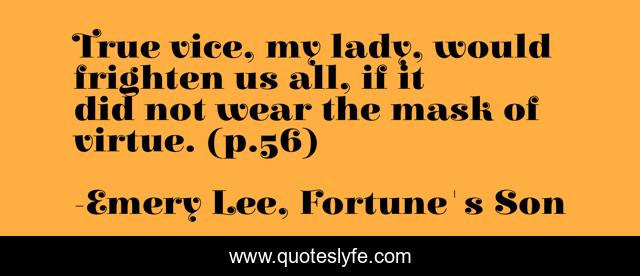 This page presents the quote "True vice, my lady, would frighten us all, if it did not wear the mask of virtue. (p.56)". Author of this quote is Emery Lee, Fortune's Son. This quote is about romance, georgian, historical-fiction,.