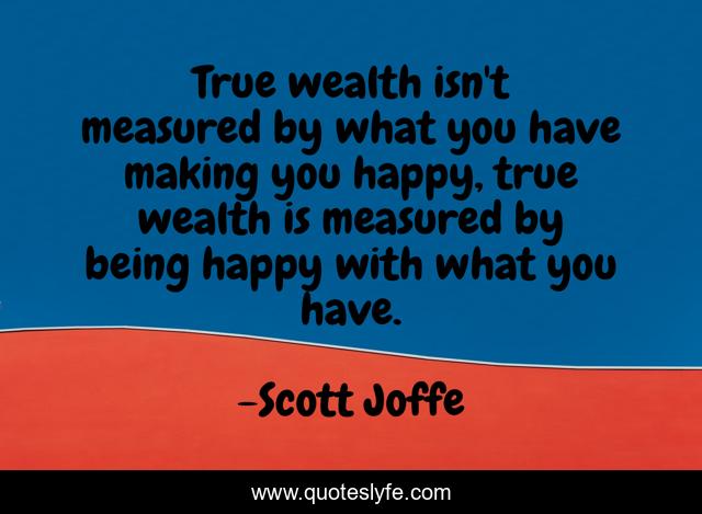 This page presents the quote "True wealth isn't measured by what you have making you happy, true wealth is measured by being happy with what you have.". Author of this quote is Scott Joffe. This quote is about wealth, happiness, self-help,.