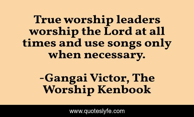This page presents the quote "True worship leaders worship the Lord at all times and use songs only when necessary.". Author of this quote is Gangai Victor, The Worship Kenbook. This quote is about christ, jesus, worship-leading, inspirational, church, enthusiasm, worship-leader, christianity, worship,.