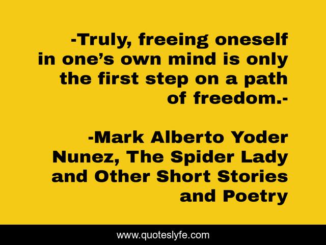 This page presents the quote "-Truly, freeing oneself in one’s own mind is only the first step on a path of freedom.-". Author of this quote is Mark Alberto Yoder Nunez, The Spider Lady and Other Short Stories and Poetry. This quote is about philosophy-of-life, aphorism, wisdom,.