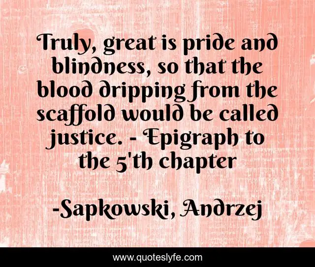 This page presents the quote "Truly, great is pride and blindness, so that the blood dripping from the scaffold would be called justice. - Epigraph to the 5'th chapter". Author of this quote is Sapkowski, Andrzej. .