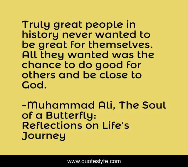 This page presents the quote "Truly great people in history never wanted to be great for themselves. All they wanted was the chance to do good for others and be close to God.". Author of this quote is Muhammad Ali, The Soul of a Butterfly: Reflections on Life's Journey. This quote is about god, good, soul, inspirational, enthusiasm,.