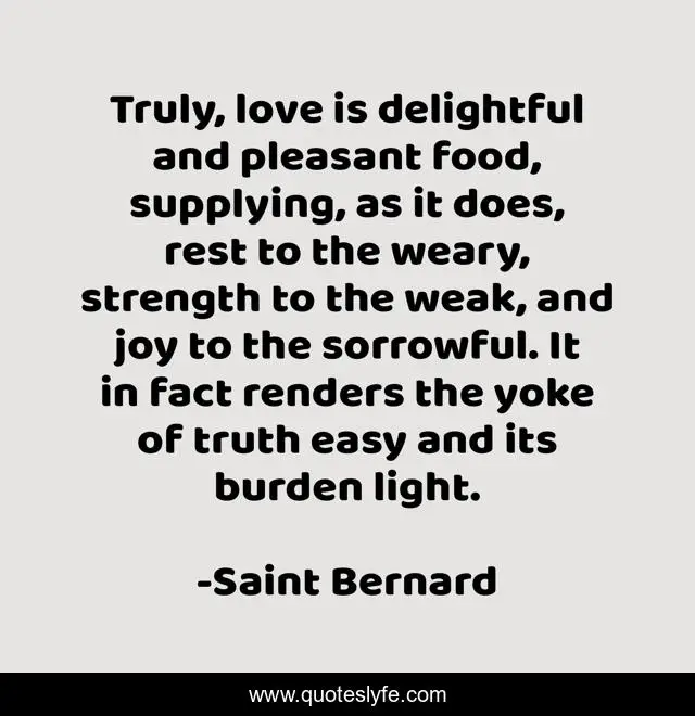 This page presents the quote "Truly, love is delightful and pleasant food, supplying, as it does, rest to the weary, strength to the weak, and joy to the sorrowful. It in fact renders the yoke of truth easy and its burden light.". Author of this quote is Saint Bernard. This quote is about food, light, love, affection,.