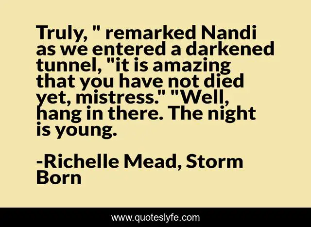 This page presents the quote "Truly, " remarked Nandi as we entered a darkened tunnel, "it is amazing that you have not died yet, mistress." "Well, hang in there. The night is young.". Author of this quote is Richelle Mead, Storm Born. This quote is about sarcasm, humour,.