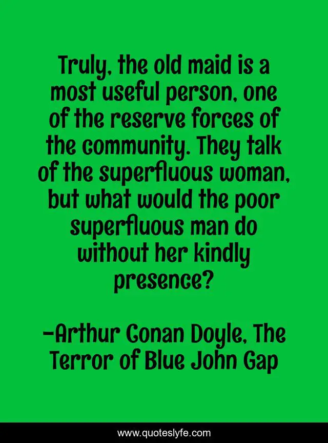 This page presents the quote "Truly, the old maid is a most useful person, one of the reserve forces of the community. They talk of the superfluous woman, but what would the poor superfluous man do without her kindly presence?". Author of this quote is Arthur Conan Doyle, The Terror of Blue John Gap. This quote is about philosophical, old-maids,.