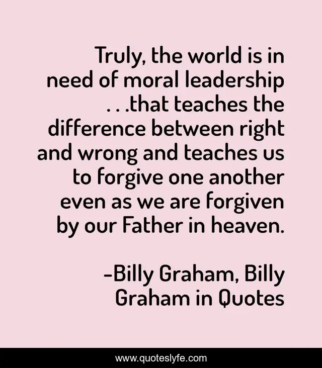 This page presents the quote "Truly, the world is in need of moral leadership . . .that teaches the difference between right and wrong and teaches us to forgive one another even as we are forgiven by our Father in heaven.". Author of this quote is Billy Graham, Billy Graham in Quotes. This quote is about moral-leadership, forgive, billy-graham, right-and-wrong, father-in-heaven, forgiveness,.