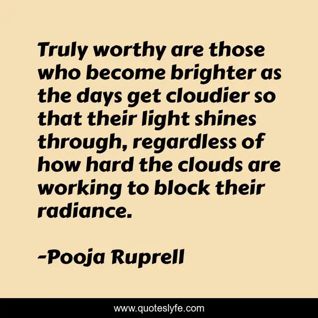 This page presents the quote "Truly worthy are those who become brighter as the days get cloudier so that their light shines through, regardless of how hard the clouds are working to block their radiance.". Author of this quote is Pooja Ruprell. This quote is about perseverance, passion, prayer,.