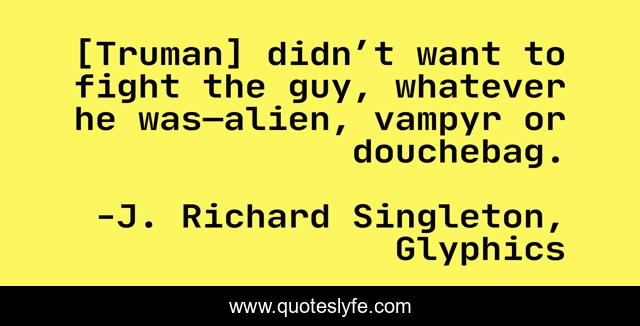 This page presents the quote "[Truman] didn’t want to fight the guy, whatever he was—alien, vampyr or douchebag.". Author of this quote is J. Richard Singleton, Glyphics. This quote is about battle, humor, paranormal,.