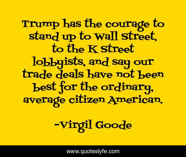 This page presents the quote "Trump has the courage to stand up to Wall Street, to the K Street lobbyists, and say our trade deals have not been best for the ordinary, average citizen American.". Author of this quote is Virgil Goode. This quote is about american, best, stand up,.