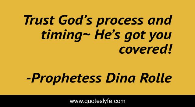 This page presents the quote "Trust God’s process and timing~ He’s got you covered!". Author of this quote is Prophetess Dina Rolle. This quote is about process, timing, trust, trusting-god,.