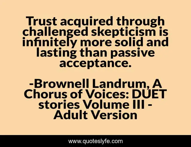 "Brownell Landrum, A Chorus of Voices: DUET stories Volume III - Adult Version Quotes." Quoteslyfe.com, 2025. Mon. 08 Dec. 2025. <https://www.quoteslyfe.com/quote/Trust-acquired-through-challenged-skepticism-is-infinitely-119447>.