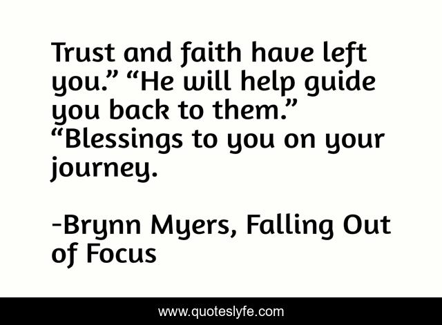 This page presents the quote "Trust and faith have left you.” “He will help guide you back to them.” “Blessings to you on your journey.". Author of this quote is Brynn Myers, Falling Out of Focus. This quote is about self-discovery, scotland, romance, fantasy, alice-in-wonderland, fae,.