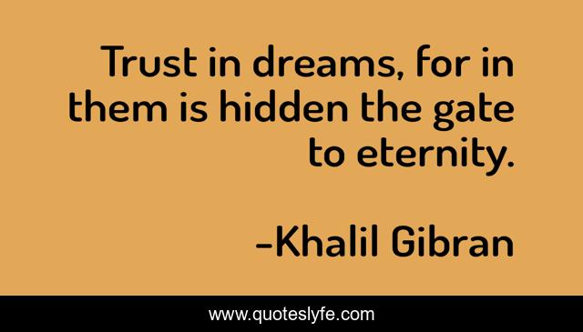 This page presents the quote "Trust in dreams, for in them is hidden the gate to eternity.". Author of this quote is Khalil Gibran. This quote is about positive, hidden, trust, confidence,.