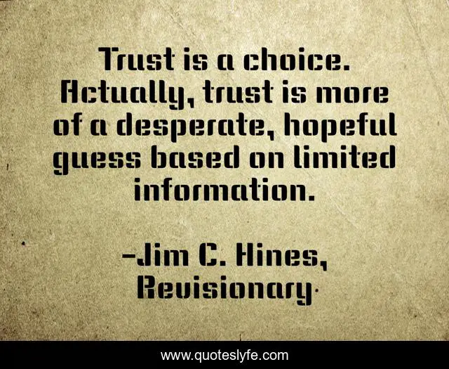 "Jim C. Hines, Revisionary Quotes." Quoteslyfe.com, 2025. Mon. 08 Dec. 2025. <https://www.quoteslyfe.com/quote/Trust-is-a-choice-Actually-trust-is-119312>.