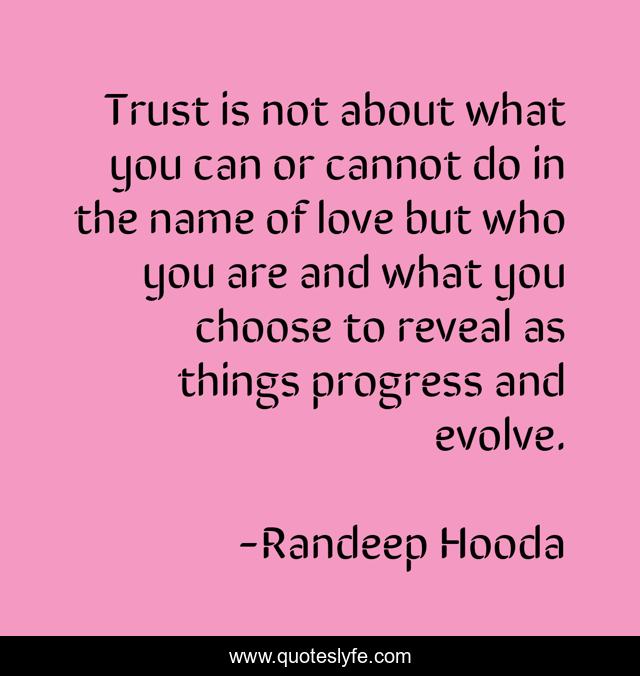This page presents the quote "Trust is not about what you can or cannot do in the name of love but who you are and what you choose to reveal as things progress and evolve.". Author of this quote is Randeep Hooda. This quote is about progress, love, name, affection,.